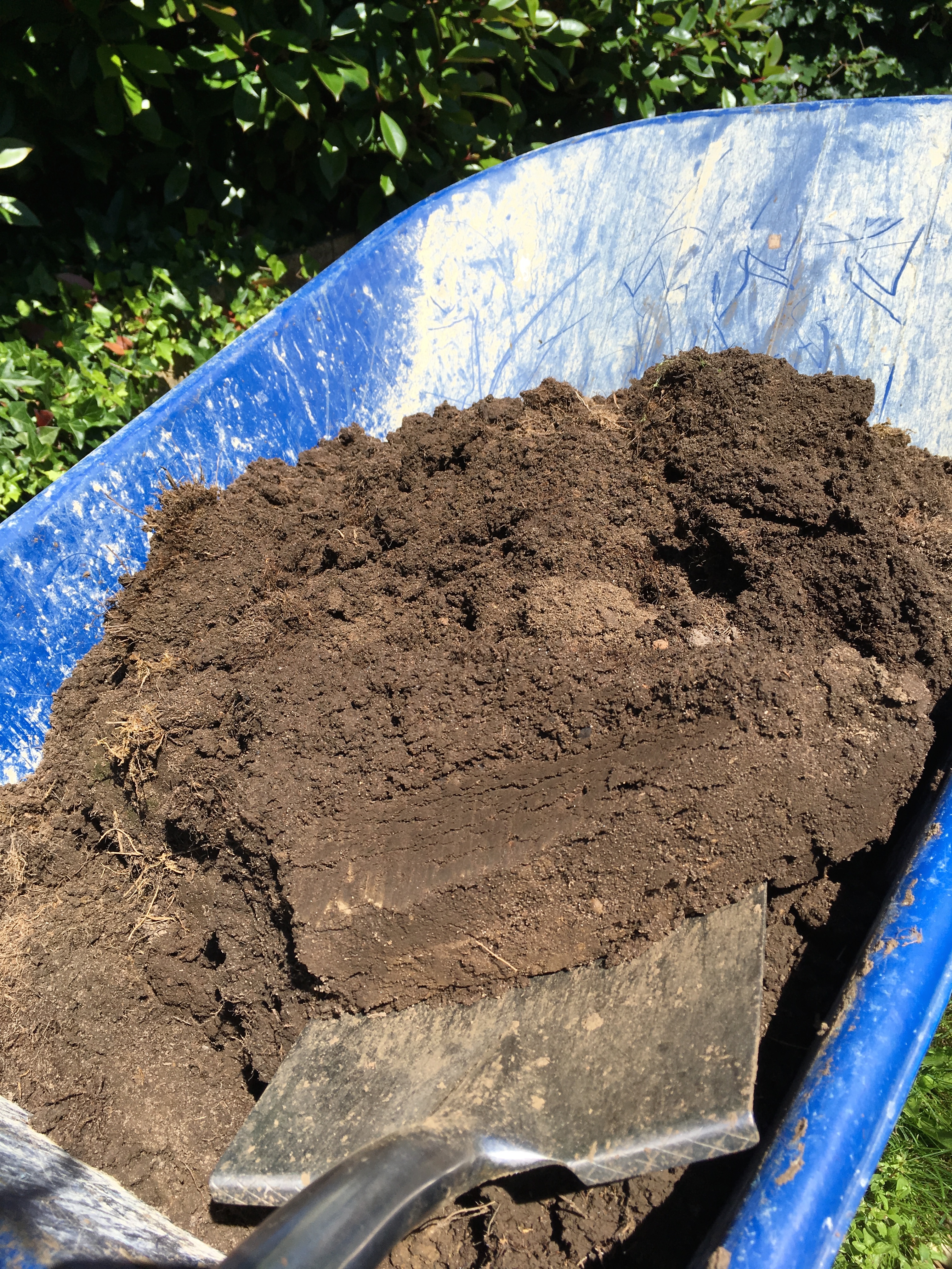Joe gallantly helped wheelbarrow the first third of the stack before he had to leave, but that got me started, and many hours later the entire stack had been redistributed into the cutting garden, and back onto the two borders, from whence it came. There were probably between 25 and 30 wheelbarrow-loads in total. Recycling at its best.