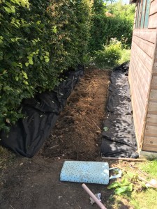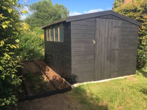 I already had some weed membrane, so off I went to B&Q to buy the treated wood and the bark, and – while I was at it – black paint for the shed.